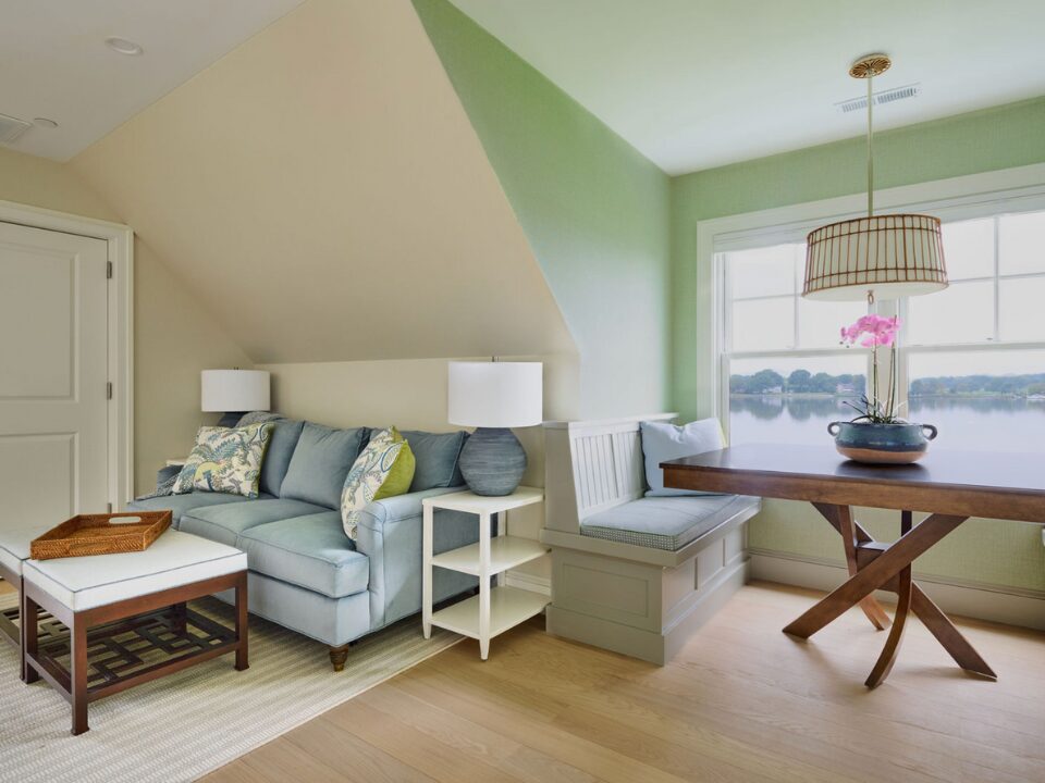 One of the dormers had an incredible view of the Chester River but challenging proportions. Standard furniture wasn’t going to cut it. We designed two custom built-in benches with cushions made through our workroom, paired with a custom table sized specifically for the nook. It turned into one of the family’s favorite spots.